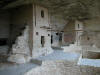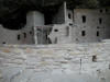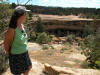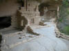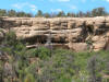 The tan cliffs are composed of sandstone, a porous rock which allows the rain, snow and running wtaer to slowly seep down through it. Beneath the sandstone is a layer of shale through which the moisture cannot penetrate, so water reaches the shale, flows between the two layers and emerges in the form of a seep or spring. In the wintertime when the moisture freezes, it cracks and loosens the sandstone causing pieces to break away. This gradual process of cracking and collapse produces the overhangs where you see the cliff dwellings today.