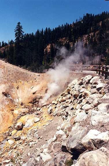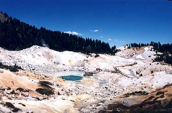 Bumpass Hell : residual mass of cooling andesite lava perhaps 3 miles deep and boiling lakes. Andesite lavas decompose readily but sulfuric acid and hot steam have greatly speeded up the process to carve out this barren 16-acre bowl. The "rotten egg" smell is hydrogen sulfide fumes, rising from deep within this mass.