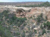 The tan cliffs are composed of sandstone, a porous rock which allows the rain, snow and running wtaer to slowly seep down through it. Beneath the sandstone is a layer of shale through which the moisture cannot penetrate, so water reaches the shale, flows between the two layers and emerges in the form of a seep or spring. In the wintertime when the moisture freezes, it cracks and loosens the sandstone causing pieces to break away. This gradual process of cracking and collapse produces the overhangs where you see the cliff dwellings today.