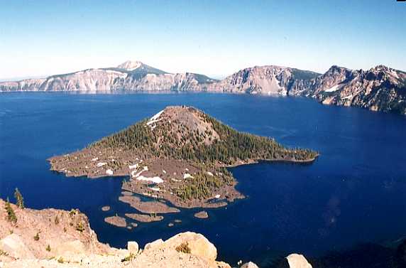 Crater Lake lies in the huge bowl-shaped caldera of Mt Mazama, a volcano that caved-in about 6,800 years ago, climaxing a series of violent eruptions. Later eruptions created the small volcano you can see on this picture, known today as Wizard Island, and sealed the caldera floor with lava flows. Geologists estimate that after the lava cooled, it may have taken nearly 800 years for snow and rain to fill the lake.