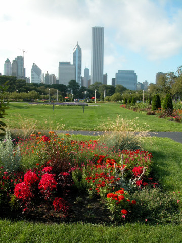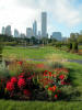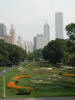 Chicago skyline seen from Buckingham Fountain in Grant Park.